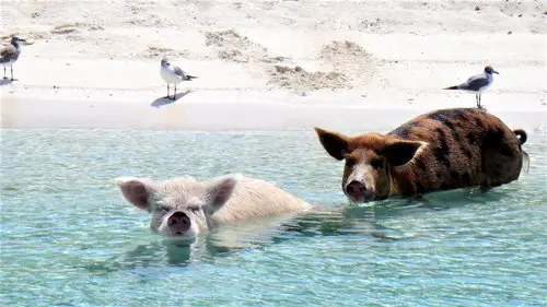 A few kilometers away from Georgetown is Rolleville Town and even this has pigs on the beach. Should you wish to save some time (if you are accommodated in George Town) as Big Major cay with its more famous pigs is a little far away, then this is a great option.