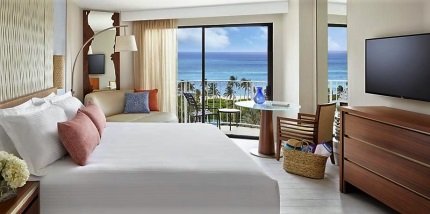 All deluxe rooms have subtle ocean themed white and pastel shaded décor with coral and light gold accents. The room contains either a king sized or two queen sized bed, HDTV and cabinet small dresser and small dining table with chairs and a balcony. The balcony which has two chairs and a small table either overlooks the resort grounds or the harbor or the ocean (distant view) depending upon the position of the room. The bathroom has modern fittings and a combined shower tub along with vanity case. The bedding, tiling and décor are all newly refurbished.